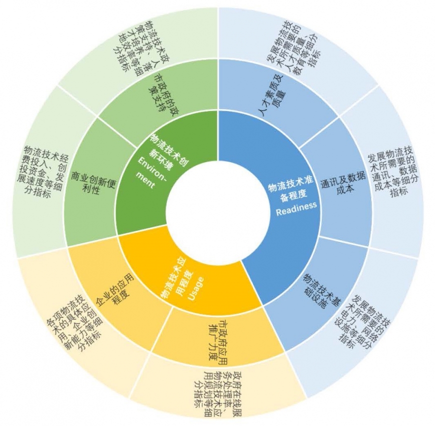 中国城市物流技术发展评价指标体系。参考世界经济论坛、欧洲工商管理学院和康奈尔大学发布的《全球信息技术报告》等权威报告,并综合田野调查与专家意见进行指标修正与三级指标扩展。其中,创新环境(Environment)是物流技术得以发展的空气和土壤,准备程度(Readiness)是物流技术得以发展的资源和要素,应用程度(Usage)是物流技术当前的开花和结果。