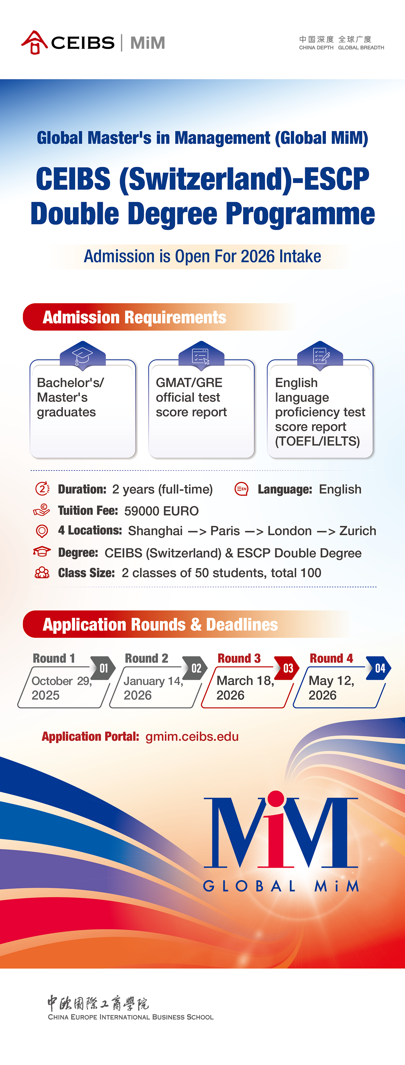 The Global Master's in Management CEIBS (Switzerland) – ESCP Double Degree Programme (Global MiM) is a double degree jointly offered by CEIBS and ESCP, two of the world's top-ranked business schools. Taught across four global business hubs - Shanghai, Paris, London, and Zurich - this programme offers students a transformative experience designed to foster a new generation of global business leaders.